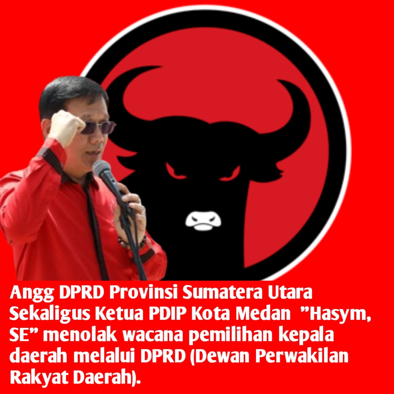Terakhir “Ini bukan soal banteng dan PDI Perjuangan. Namun, lebih luas dari itu, yakni soal hak demokrasi yang diduga akan dirampas dari rakyat. Kami menolak pengebirian hak konstitusional rakyat, terutama dalam aspek demokrasi. Kami menolak Pilkada kembali melalui DPRD. Merdeka,”tutup Hasym,SE.(Ismuda)