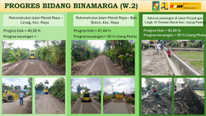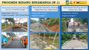 Kepala Bidang Jalan Dinas PUTR Kabupaten Simalungun, Agus Sinaga, menjelaskan bahwa sepanjang Tahun Anggaran 2025, Dinas PUTR menangani 194 paket pengerjaan infrastruktur jalan dan jembatan. Dari total tersebut, progres pengerjaan sudah mencapai 35 persen hingga pertengahan Oktober 2025.