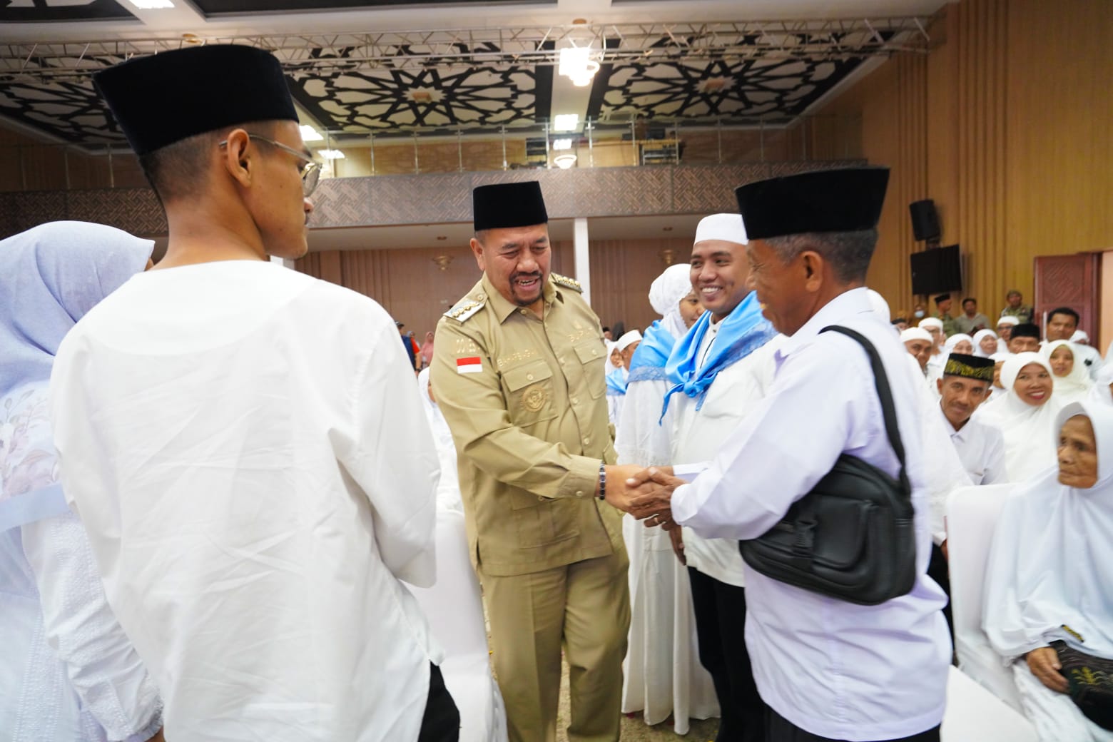 Rangkaian acara diawali dengan pembacaan ayat suci Al-Qur’an, dilanjutkan penyantunan anak yatim, serta prosesi pemasangan kain tanda pengenal kepada perwakilan 20 regu jemaah calon haji.