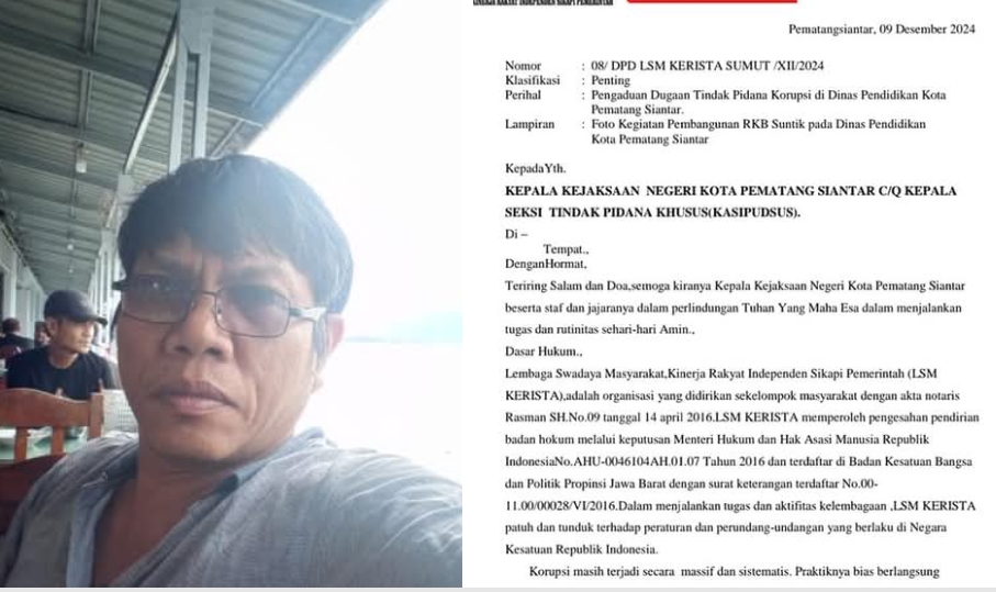 Update24News.id l Pematangsiantar, Dewan Pimpinan Daerah (DPD) LSM Kerista Sumut akan melaporkan Dinas Pendidikan Kota Pematangsiantar ke Kejaksaan Negeri Siantar terkait dugaan tindak pidana korupsi pada pelaksanaan kegiatan konstruksi yang saat ini sedang berlangsung.