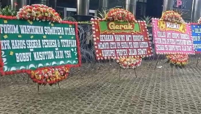 Dimana terlihat berbagai karangan bunga atau papan bunga yang bertuliskan dukungan dan desakan terhadap KPK untuk memeriksa Gubernur Sumut Bobby Nasution.