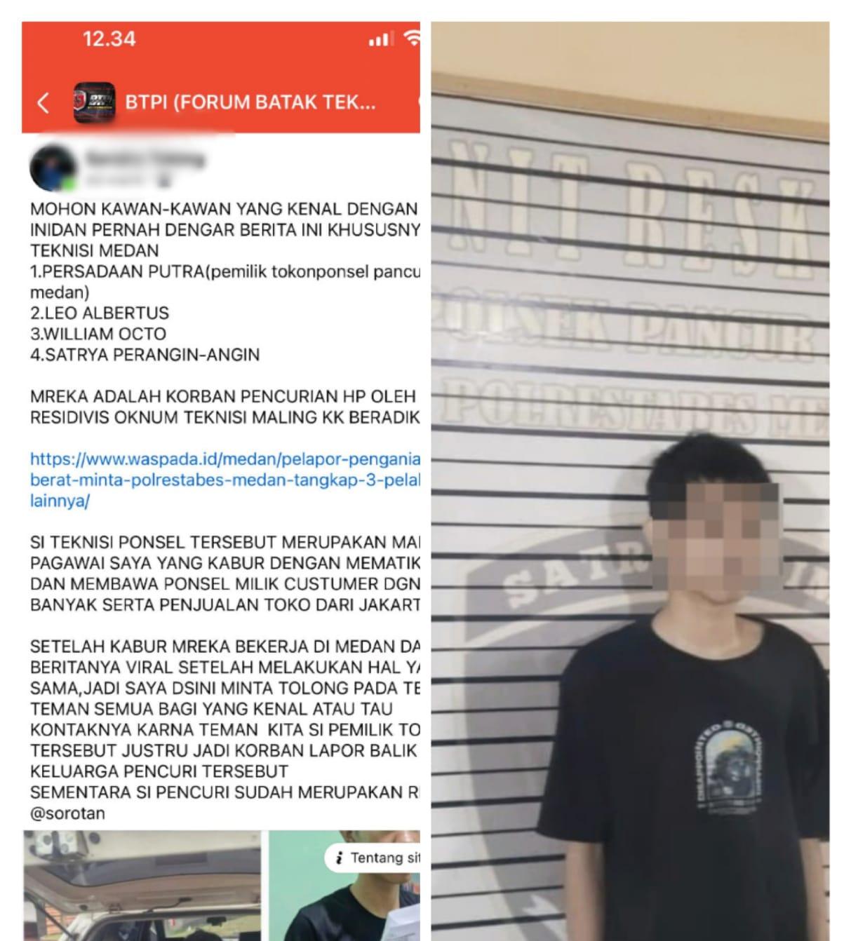 “Mohon kawan-kawan yang kenal dengan orang ini, pernah dengar berita khususnya teknisi Medan. Persadaan Putra, Leo Albertus, Wiliam Octo Satria Perangin Angin, mereka adalah korban pencurian HP oleh residivis oknum teknisi maling kakak beradik,” tulisnya.