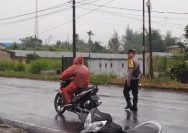 Ditengah Guyuran Hujan, Aipda Joni Susanto Purba Tetap Semangat Jalankan Tugas Atur Lalu Lintas